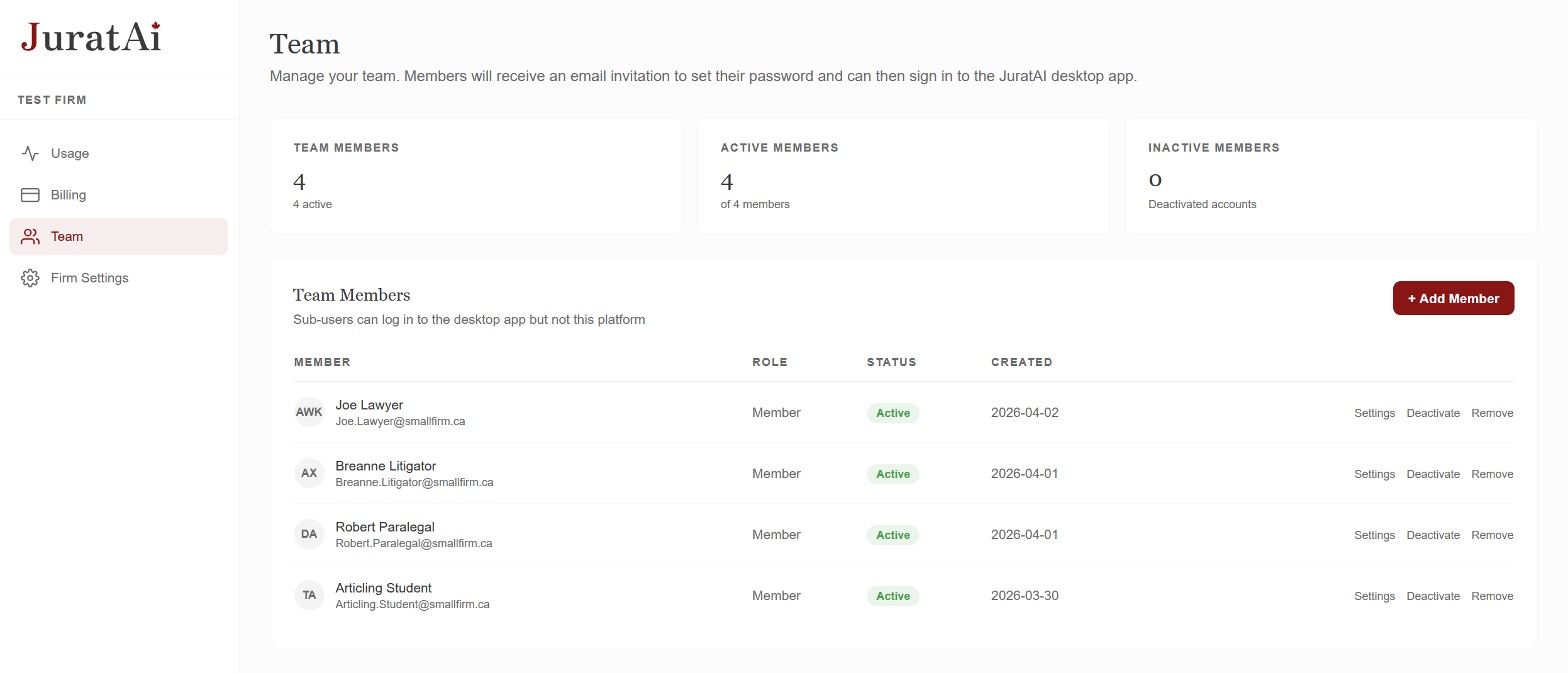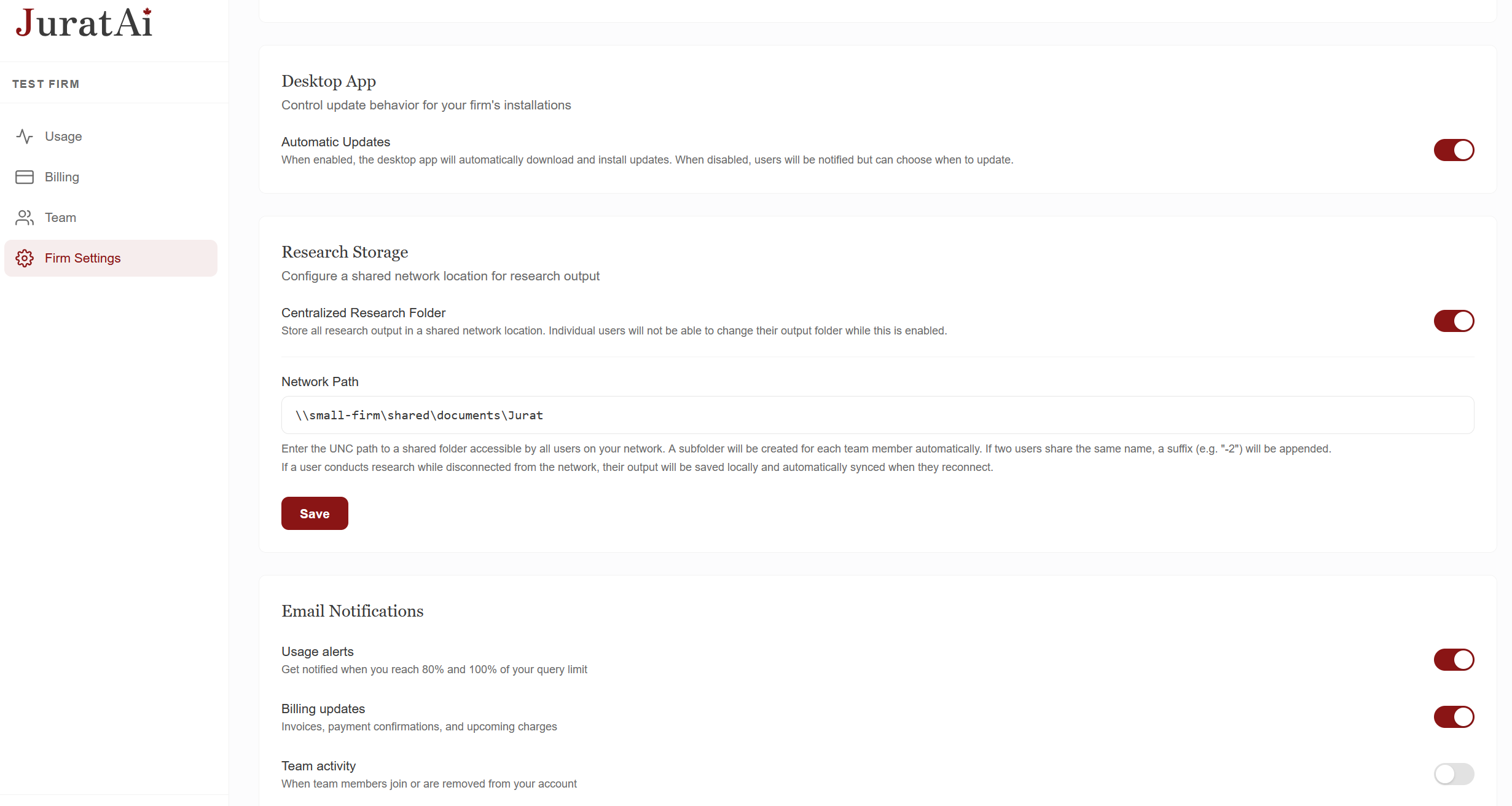 A web console for managing your firm's seats, spending caps, and storage — without ever touching billable time.