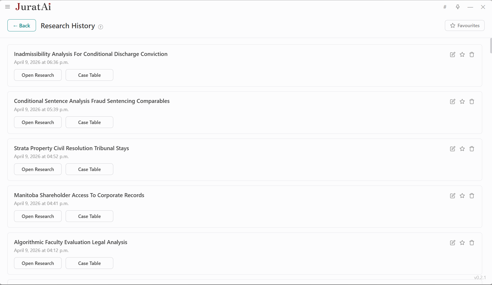 Every research session is saved locally — never synced to the cloud — so you can revisit prior work, mark favourites, and reopen files in one click.